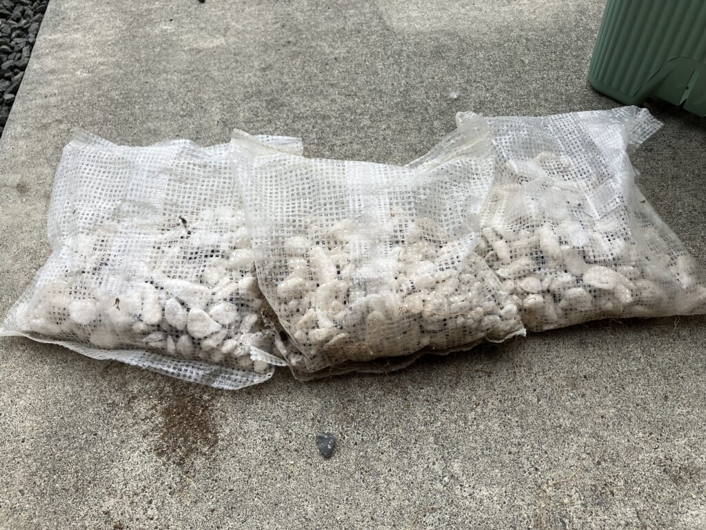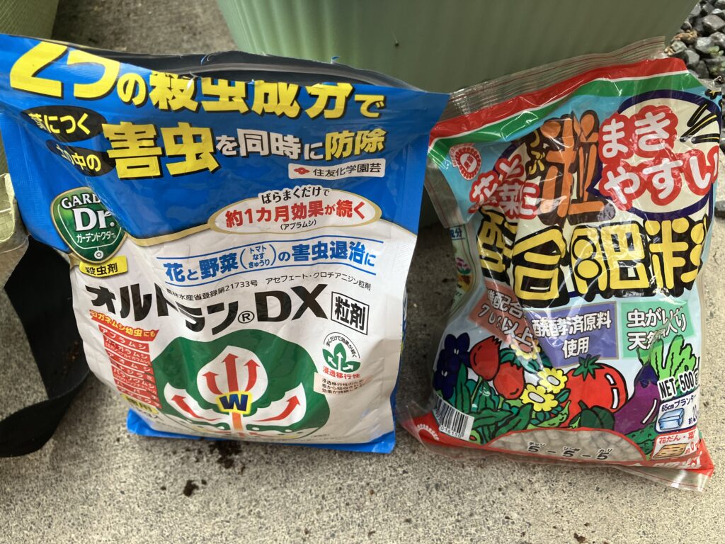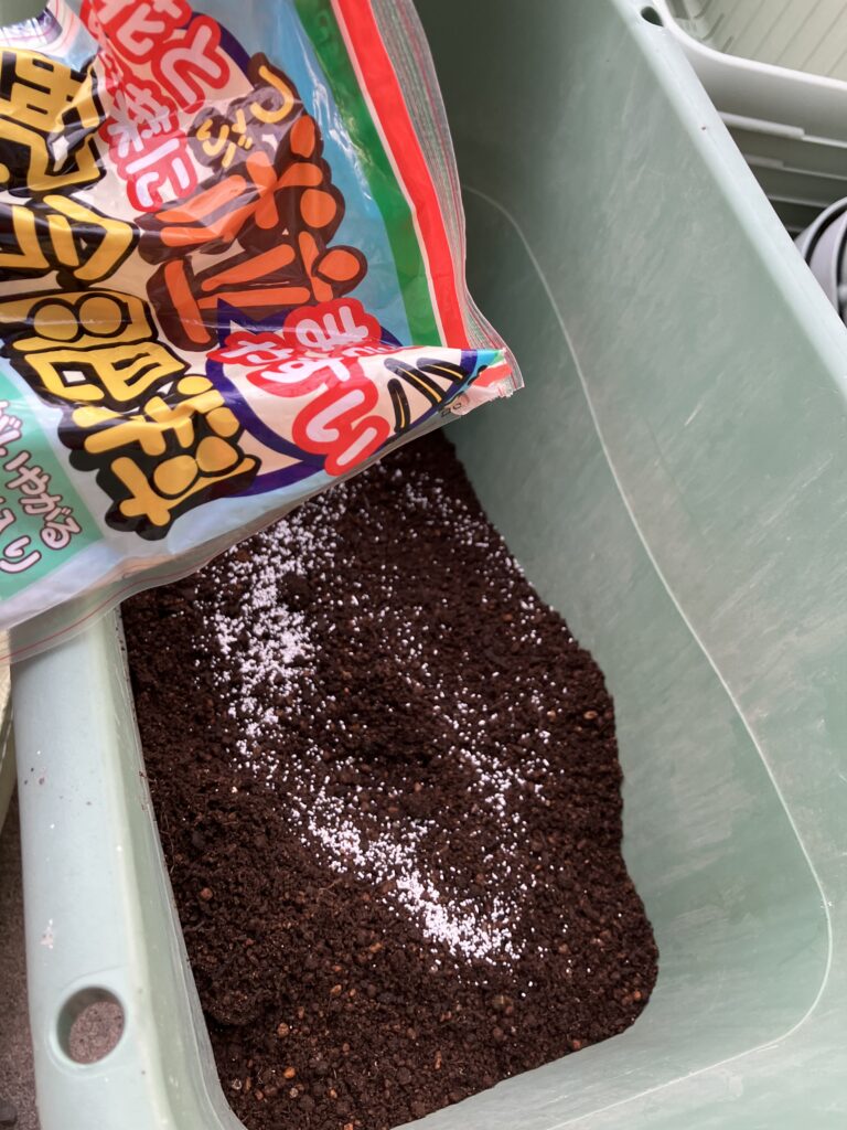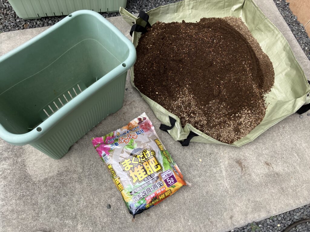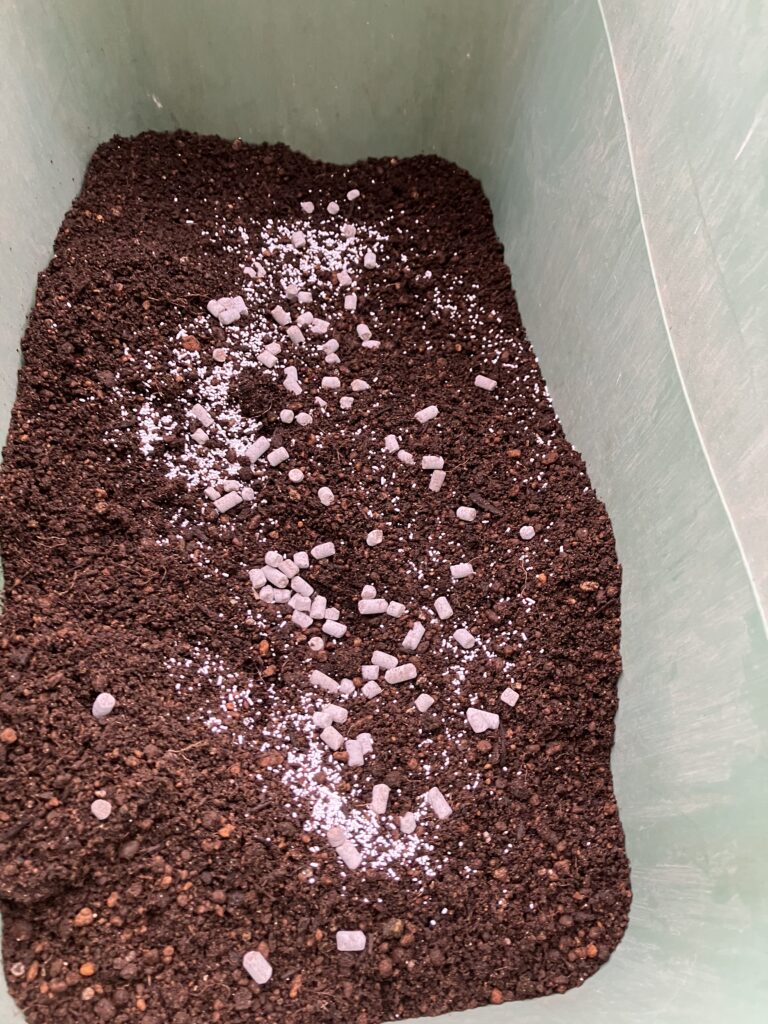 底石を敷いたプランターに、培養土・肥料・農薬を混ぜて準備完了。