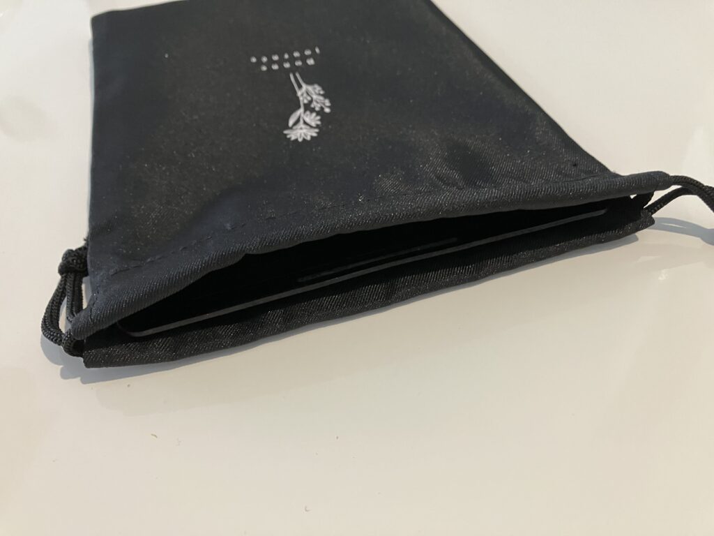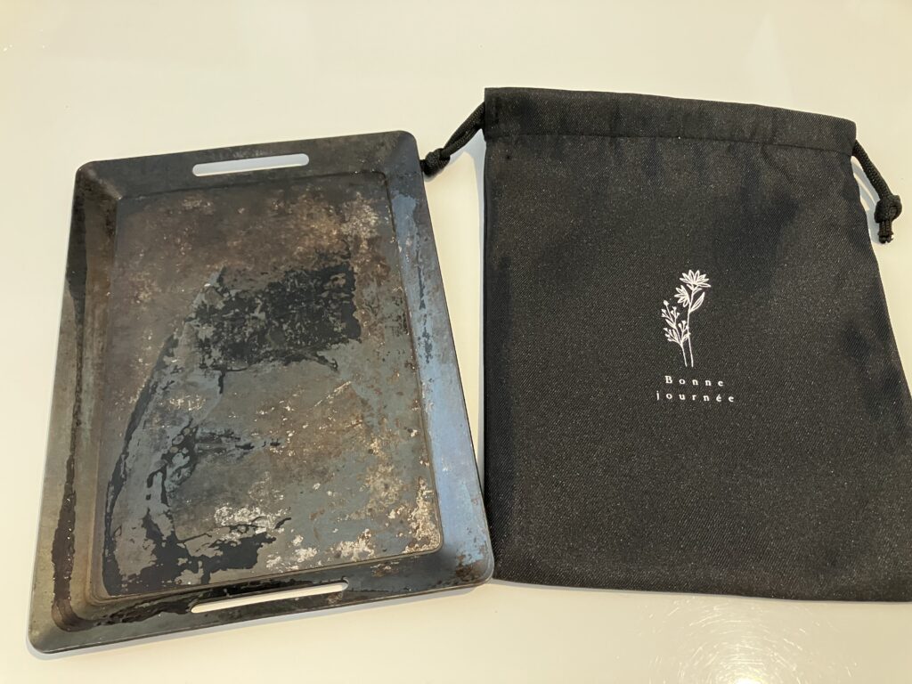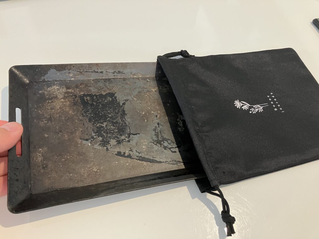 筆者が使っているのは、厚さ200mm×145mmのダイソー330円鉄板。これが、巾着袋にすっぽり収まる!