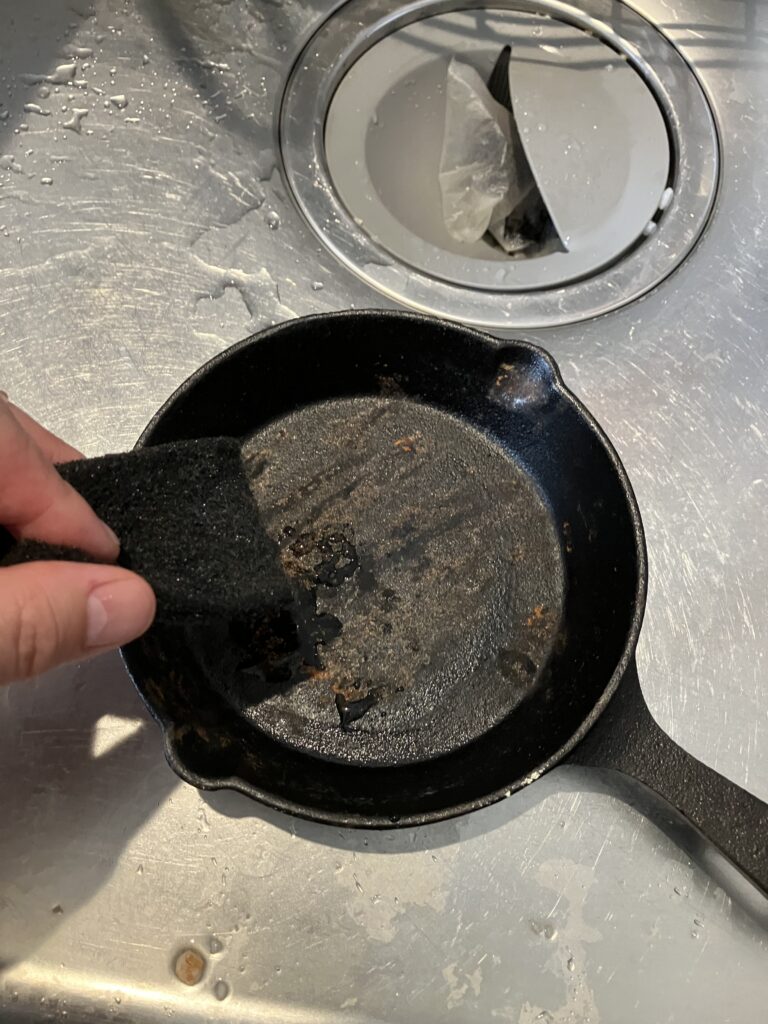 新品のスキレットには防錆剤が塗られているため、まずは洗剤でしっかり洗い落とします。