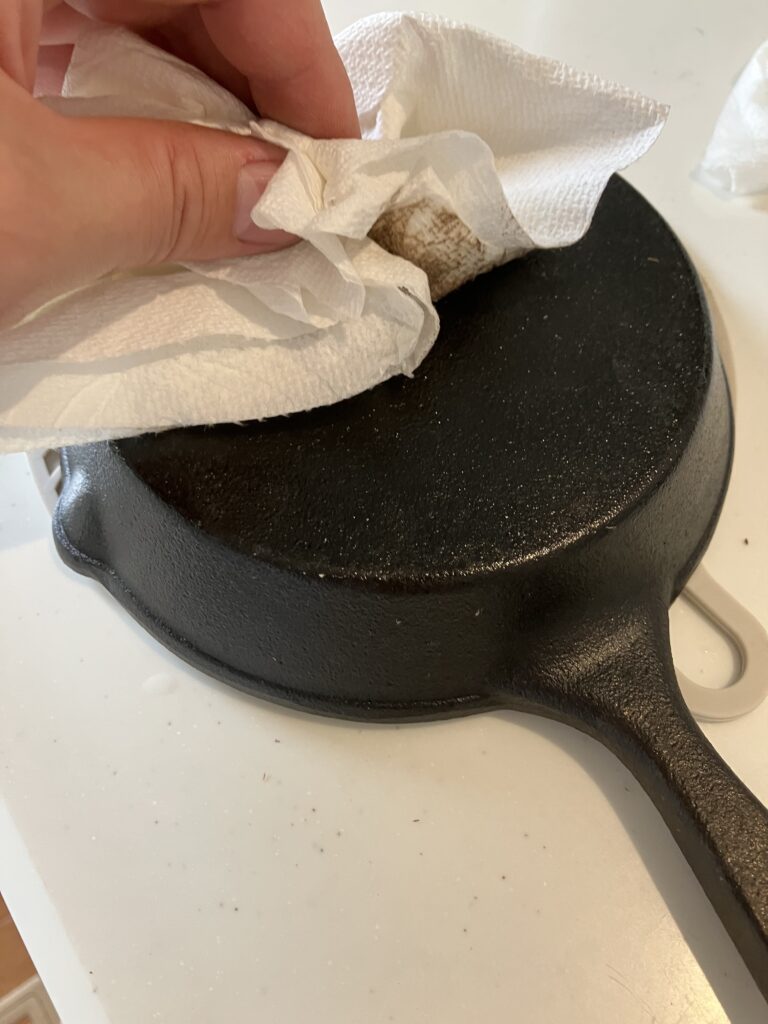 キッチンペーパーで全体に薄く油を塗ります。持ち手や裏面も忘れずに。