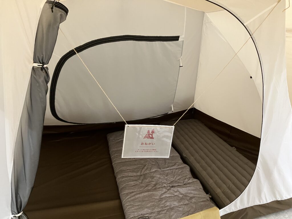 リビングスペースと寝室を分けられる2ルーム構造は、キャンプ中の生活動線をスムーズに。天井高は180cm以上あり、圧迫感もなく、LEDライトを吊るすポイントも複数設けられています。