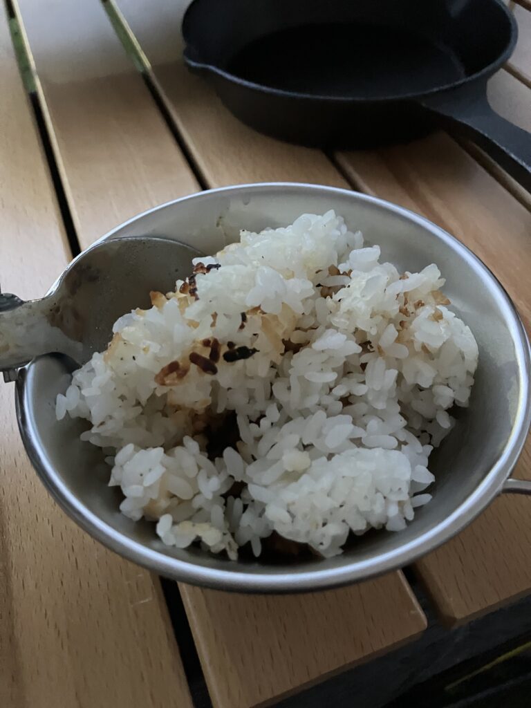 静かな森の中、焚き火の炎を眺めながら食べる中辛カレー。