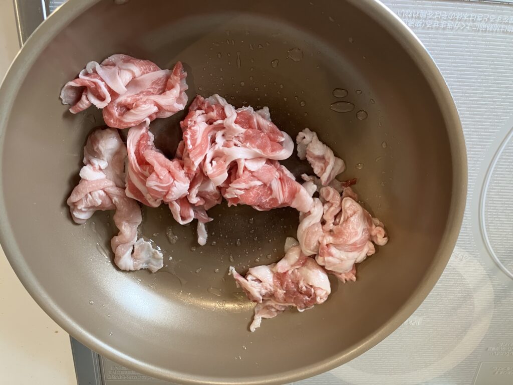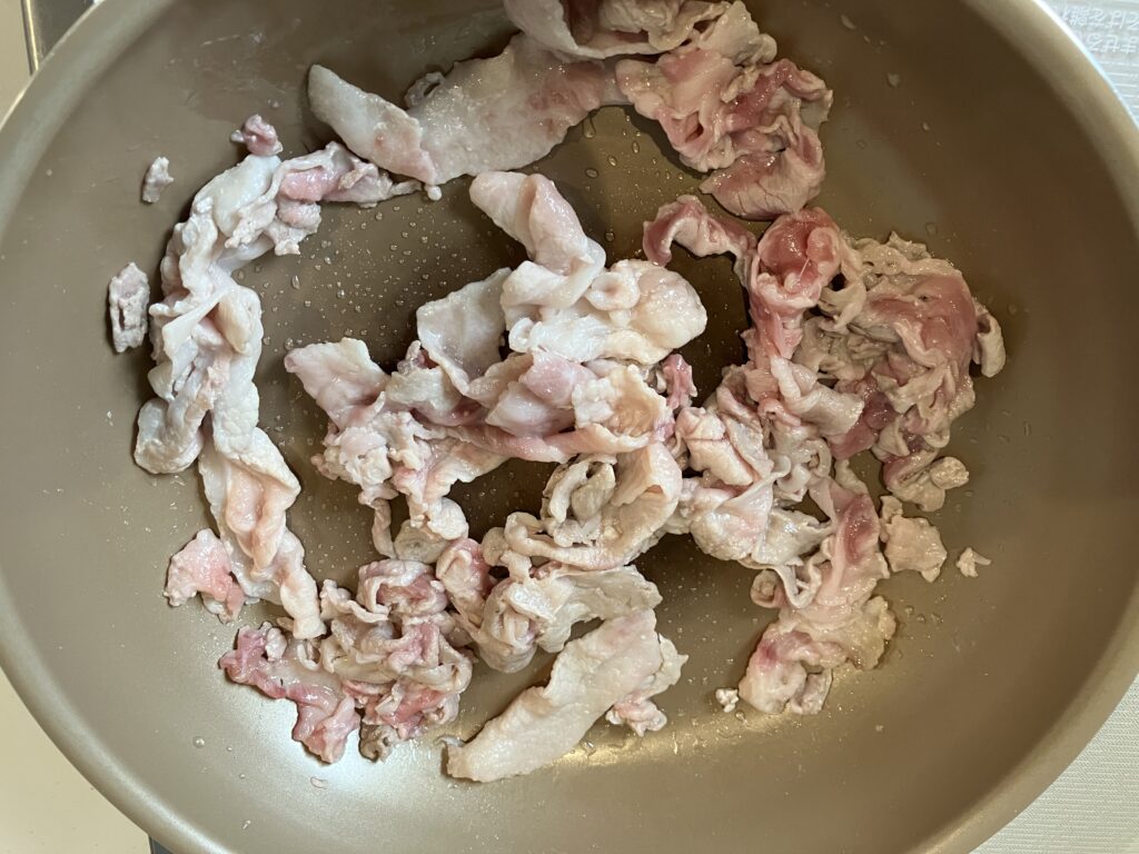 フライパンに油を引き、我が家定番の豚小間を投入。