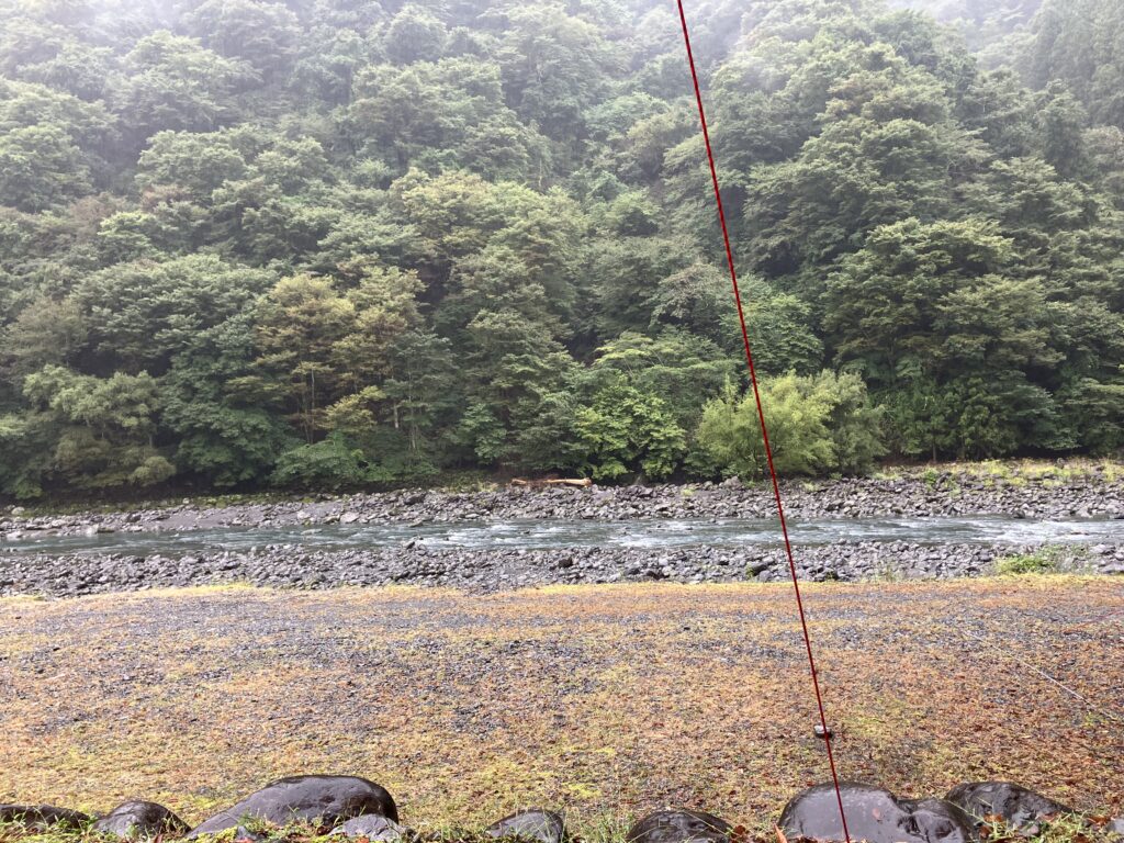 降りしきる雨の中、外に出ると、タープが無残に倒れ、風に煽られてバタついていた。